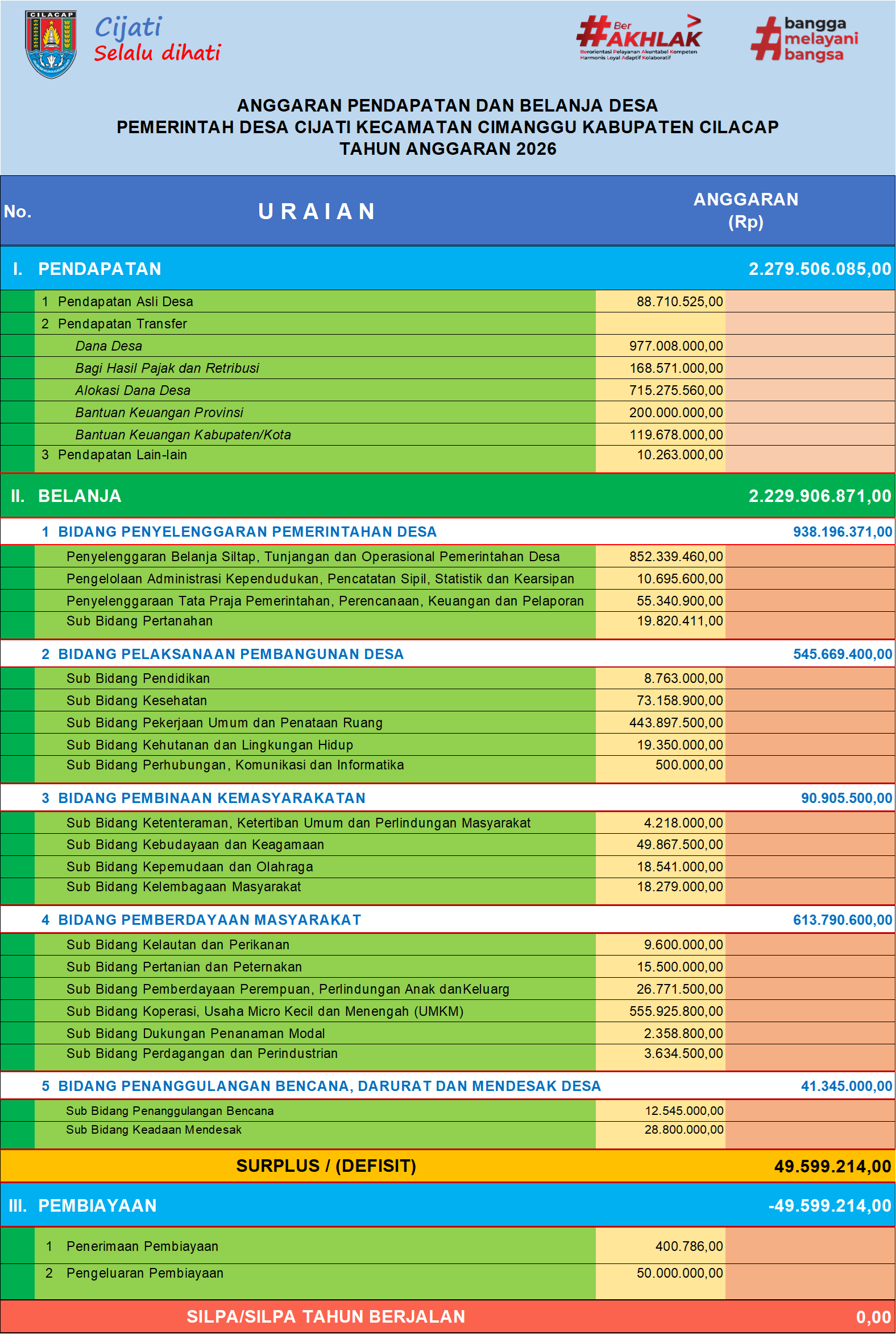 Sesuai dengan Peraturan Desa Cijati Nomor 10 Tahun 2025 tanggal 31 Desember 2025, Anggaran Pendapatan dan Belanja Desa Cijati Tahun Anggaran 2026 sebesar Rp. 2.279.506.085,00, yang berasal dari Pendapatan Asli Desa, Pendapatan Transfer dan Pendapatan lain-Lain.